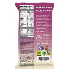 Coconut milk, meet lower sugar chocolate! The Good Chocolate’s dark chocolate coconut milk chocolate is a groundbreaking vegan milk chocolate style that’s also made without added sugar. It has less sugar than traditional dark chocolates and really satisfies that milk chocolate sweet tooth. The Double Crunch dark chocolate coconut milk bar is sprinkled with sweet crispy crystals and authentic cocoa nibs, making it a wickedly satisfying crunchy chocolate treat that’s low net-carb and keto-friendly. (Not a low-calorie food.)